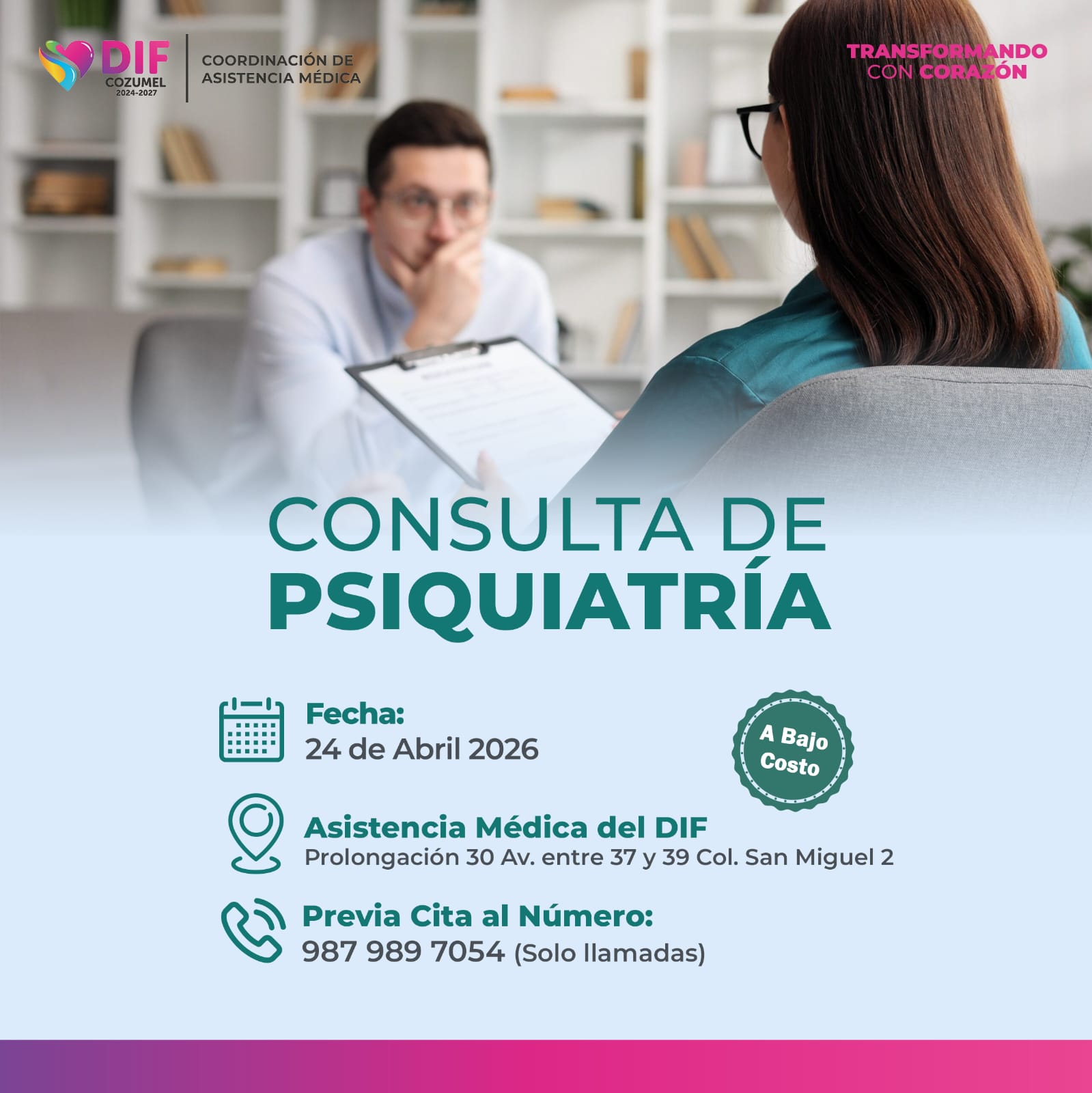 La atención se brindará en las instalaciones de Asistencia Médica del DIF Cozumel, ubicadas en la Prolongación 30 avenida, entre calles 37 y 39 de la colonia San Miguel II, facilitando el acceso a servicios médicos dignos y de calidad para la comunidad.
